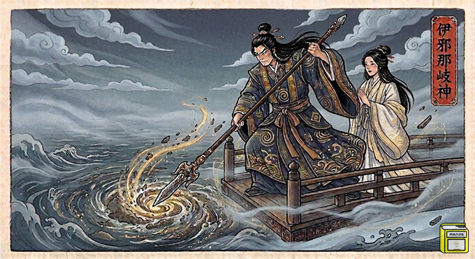 「国生み・神生み」の主宰: 天の浮橋(あめのうきはし)に立ち、沼矛(ぬぼこ)で混沌をかき混ぜてオノゴロ島を造り、そこから日本の島々や、火・水・山など自然界の神々を次々と生み出しました。