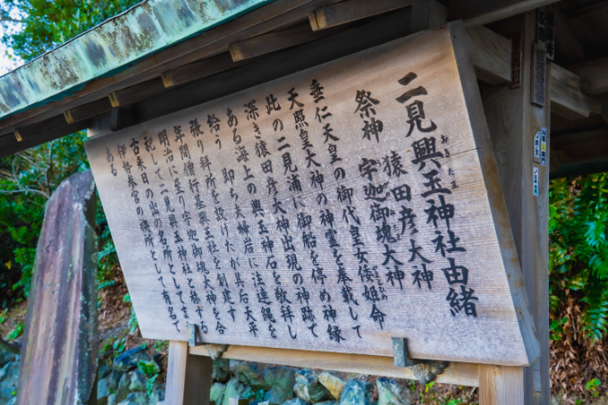 二見興玉神社の歴史は古く、第10代垂仁天皇の御代に倭姫が八咫鏡(天照大御神)と共にこの地(二見浦)にやってきた際、興玉神(猿田彦大神)が現在の伊勢神宮内宮の地を案内したところ天照大御神はひどく喜び、鎮座することになりました。
