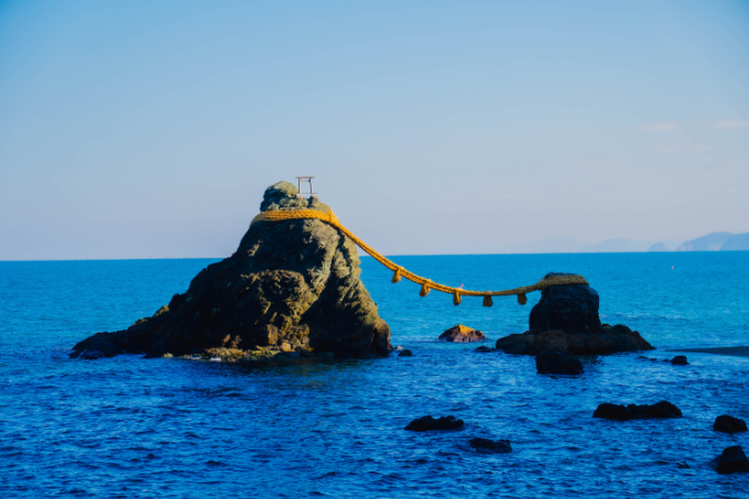 夫婦岩は沖合約700m先にある「興玉神石」という猿田彦大神ゆかりの霊石を遥拝するための鳥居としての役割だと考えられています。