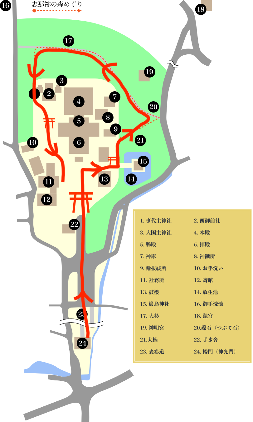 帰り道に、図の左側(西側)にある大国主神社や西御前神社などを巡ります。